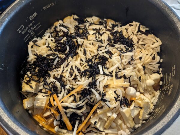 (3) Place the mushrooms (I used enoki and shiitake this time), carrot, fried tofu, hijiki, and dried daikon on top of the rice.