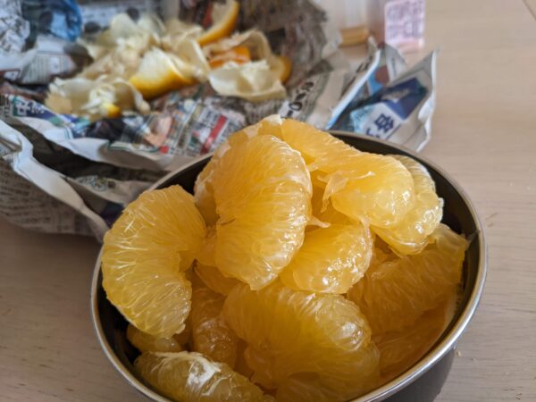 So I peeled three amanatsu oranges and stored them in the fridge. Now we have a little fruit ready to enjoy anytime, which always makes me happy.