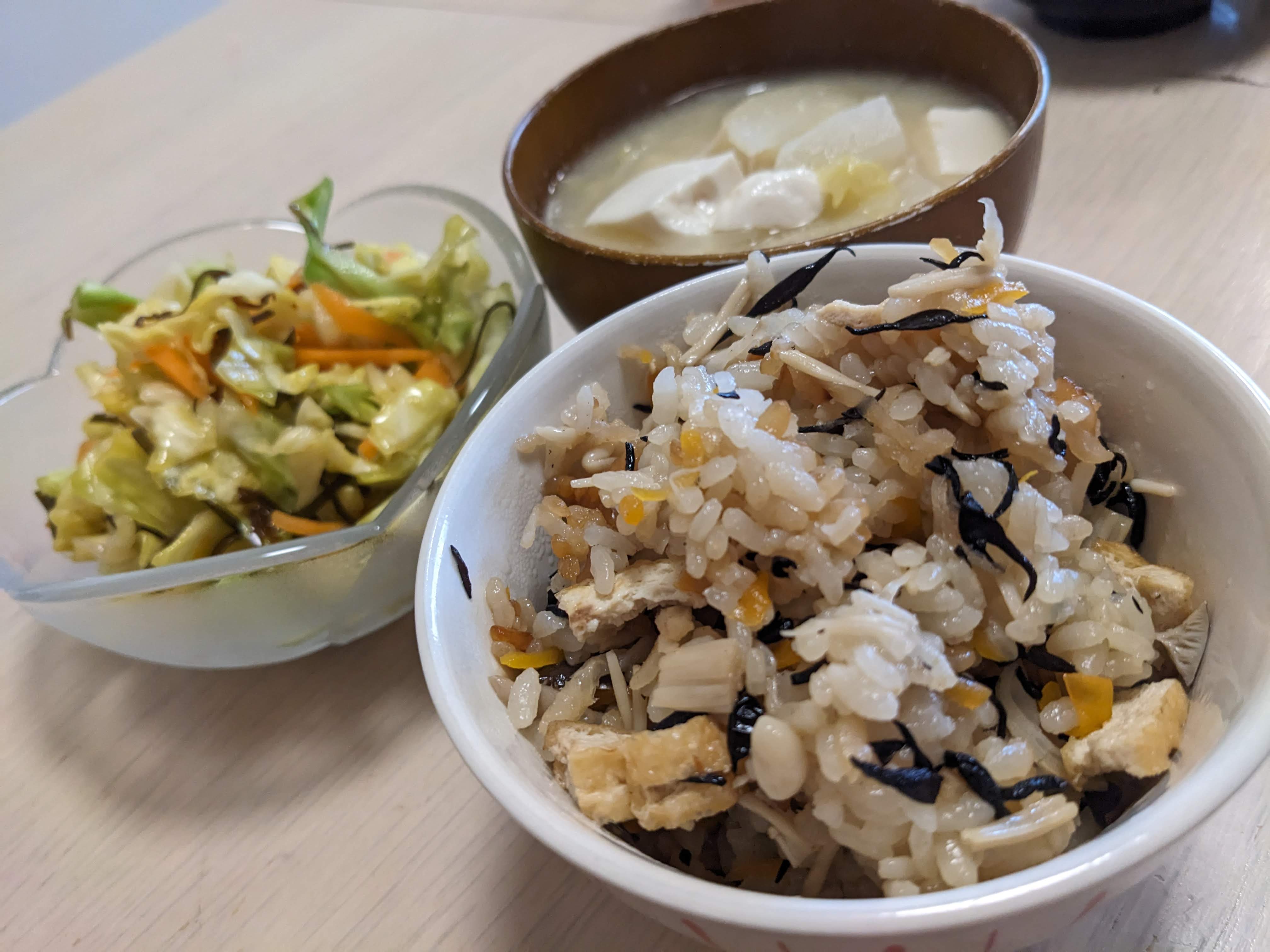 I also made a big pot of miso soup with lots of vegetables. With hearty miso soup and this vegetable rice, we don’t really need any other dishes. But yesterday we also had some cabbage pickles I had made earlier. That was a lucky extra.