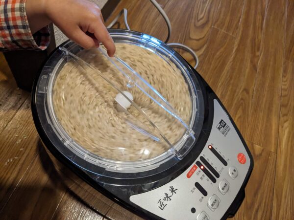 They seem to enjoy scooping the tiny grains of rice and pouring them into the machine.