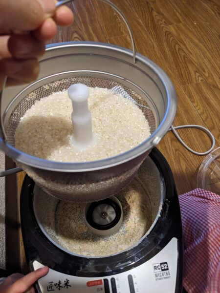 We start with brown rice and use a small home rice mill to turn it into white rice.